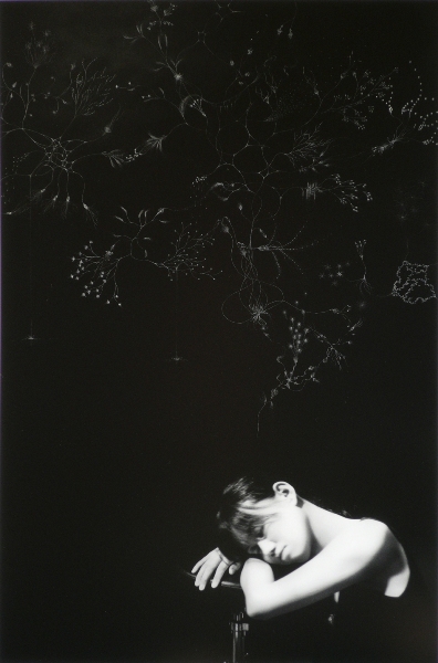 柔らかな光沢を持つ印画紙の表面は、針の先で削られてめくれ、支持体の紙が覗いて、かぼそくも白く鋭い線となる。ポートレイトに絡みつくように描かれたそれらは、植物のつるのようであったり、背景一面に降り注ぐ雨であったり、背中に生える翼であったり、頭の上にチョコンとかぶせられたティアラであったりする。楽しげに描かれたこれらの絵は、ただひたすらにかいわらしく、やさしい。(以下、略)