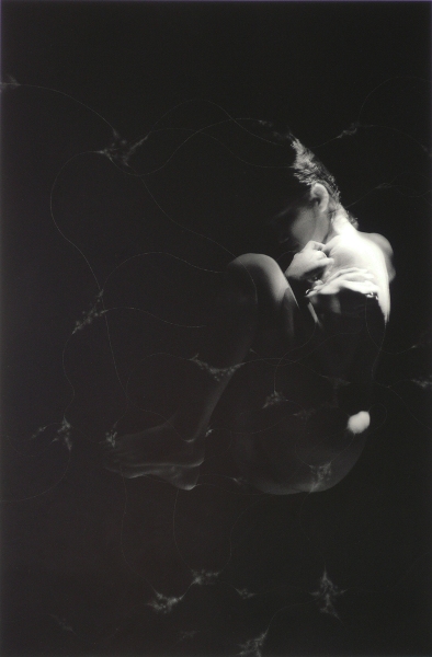 井村の作品はたしかに写真なのですが、よく見ると画面のそこここに淡く白い線や点が無数に刻まれて、煙のような絵が描かれています。
