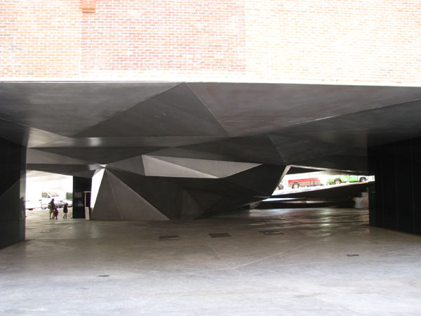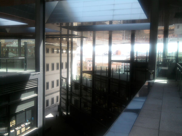 建物の上の方の中から見た壁。国立王妃ソフィア芸術センターの拡張部分(設計:ジャン・ヌーベル)