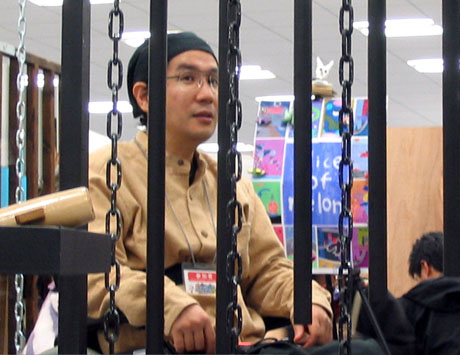その中に音響彫刻「鐘の牢」という強烈な作品がありました。これは檻のような金属棒(長さが違って音階になっている)に囲まれた中に演奏者が入って、その檻を叩いて「演奏」するのです。