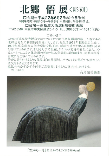 一昨年7年ぶりの新作展をときの忘れものと銀座のギャラリーせいほうで開いた彫刻家の北郷悟先生ですが、東京藝大の副学長という激務の間を縫って、大阪では初の個展を開催されます。
