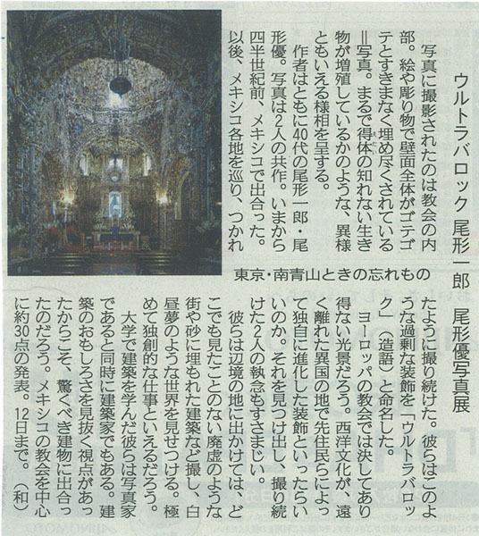キリスト教とメキシコの土着の文化・宗教が交じり合って生まれた過剰装飾の教会建築「ウルトラバロック」を、建築家でもある作家の興味に満ちた視点で捉えた写真作品29点をご覧いただきます。今回新たにプリントした作品は、ライトジェットプリントという通常の銀塩ペーパーを使った技法で制作されおり、いわゆる出力によるものではありません。これは、高速回転するドラムにセットされた銀塩ペーパーに、レーザーで画像を焼き付けることにより、イメージの端から端まで均等な露光を得られるため、引き伸ばし機のレンズを通した場合と比べて、イメージ周辺部のボケや減光のない、クリアなプリントとなります。展示されているほとんどの作品は、写真集でも知られたイメージではありますが、プリントをご覧になるのは初めてという方が多く、その精緻な写真と、そこに写るウルトラバロックな世界にすっかり引き込まれていらっしゃいます。どうぞお出かけください。