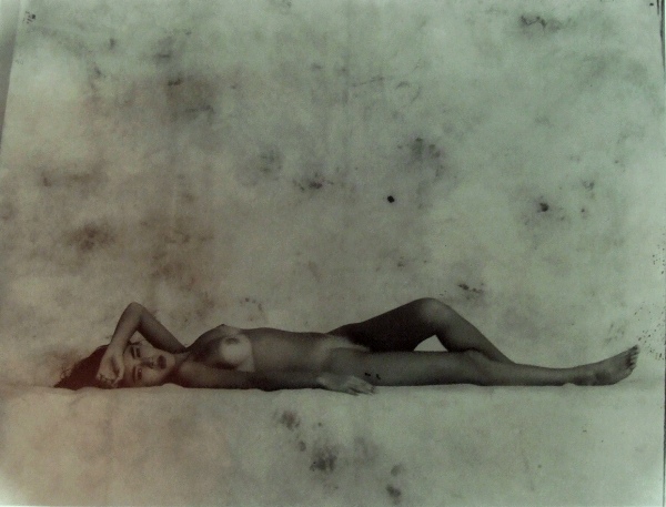 この作品は、五味彬とトニ・メネグッツォがそれぞれの方法で日本人を捉えた写真集「nude of J」(1991年、朝日出版社刊)のために撮影されたものです。写真集に収録された五味先生の作品は、「YELLOWS」シリーズと同様に正面から表情を消して撮影されたものに絞られていますが、この作品は未収録ながら、モデルの村上麗奈の持つオーラを存分に引き出しており、他の作品とは一線を画しています。それも、左手のしぐさと、目の表情だけでこれだけの妖艶さを表現できるというのは驚くべきことです。五味先生ご自身によるプリントです。