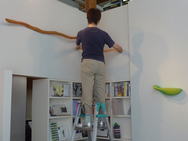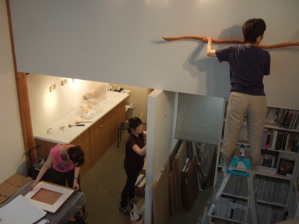 美しい女性作家三人がそれぞれ割り振られた壁面の前で四苦八苦。13時から19時までかけて、どうやらそれぞれの個性が反映した展示になりました。