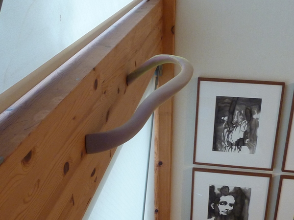 「人気を感じる」ということは見えない空気が震えているという事です。そんな目には見えない空気の震えを表してみたくて一階から2階へ繋がるような作品を創ってみようと思いました。