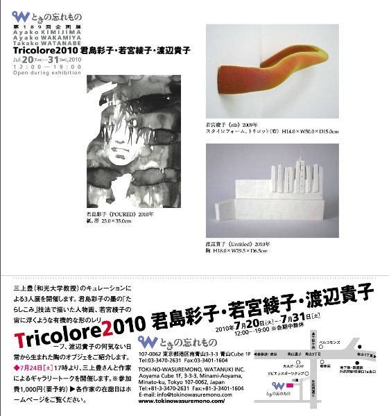 ◆ときの忘れものは、2010年7月20日[火]―7月31日[土]に三上豊さん(和光大学教授)のキューレーションで「Tricolore2010―君島彩子・若宮綾子・渡辺貴子」展を開催しています(会期中無休)。