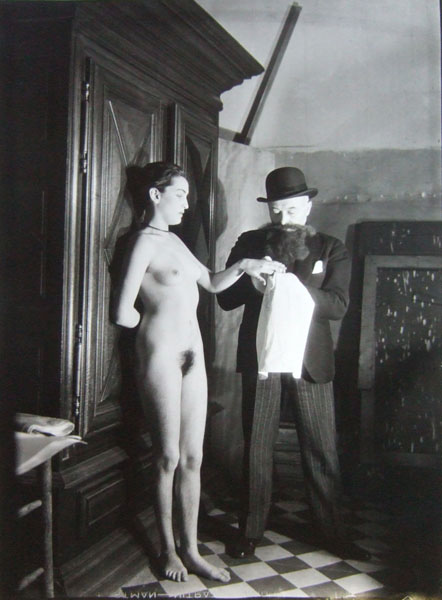 この作品で被写体となっているメレット・オッペンハイムは、1913年ベルリン生まれ、16歳頃からクレーらバウハウスの作品に影響を受けてシュルレアリスムの作品を作り始めます。1932年にパリの美術学校に通っている頃にジャコメッティと知り合い、ジャコメッティがマン・レイに彼女を紹介しました。マン・レイは彼女のことを「それまで会ったなかで、いちばん因習などに束縛されない女性のひとりだった。」と書いていますが、この作品が撮影された時は、20歳ということになりますから、実際かなり進んだ女性だったのでしょう。このほか多くの作品のモデルとなっています。