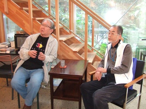 早速来廊された細江英公先生、右は亭主の大昔からのお客さまの横島正元さん。