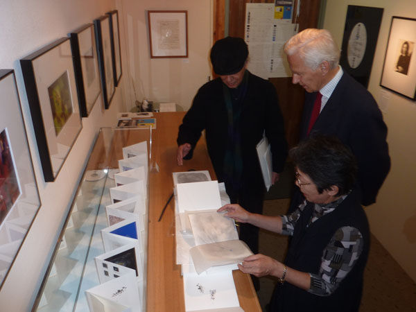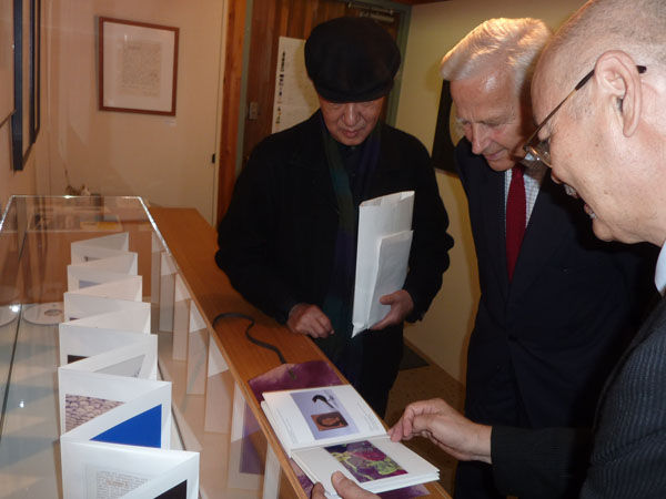 宮脇折本を見るファンクマン折本のドローイングを説明する社長左)『マン・レイへのオマージュ』をご覧になる