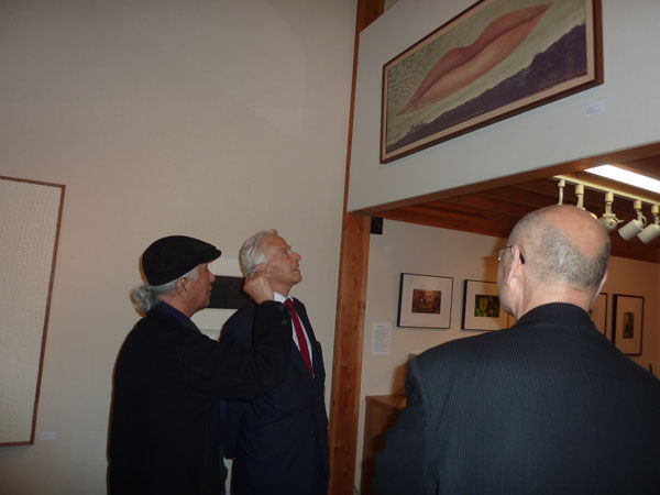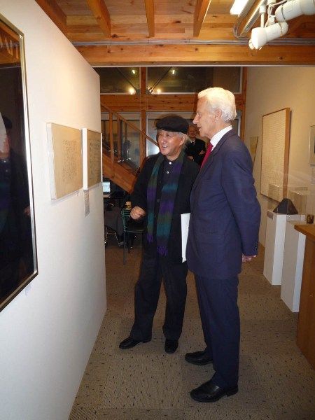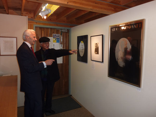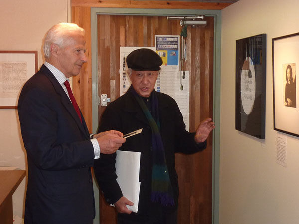 ミラー作品の前、ファルクマン、磯崎新自作ポスターを指差す磯崎新左)スウェーデン俳句協会会長で同国外務省特別顧問でもあるカイ・ファルクマンさんが磯崎新先生と来廊。