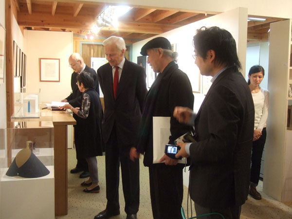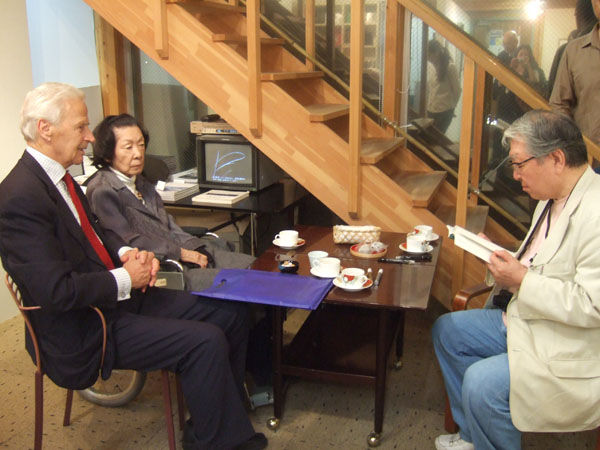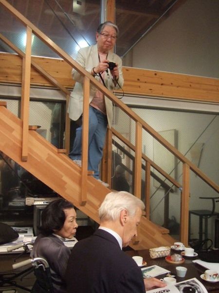 右)同じタイプの椅子を図書館の貴賓室用にもつくり、その椅子に天皇陛下が坐ったという昔話をファルクマンさんに説明する磯崎先生。階段のカメラマンに注目。