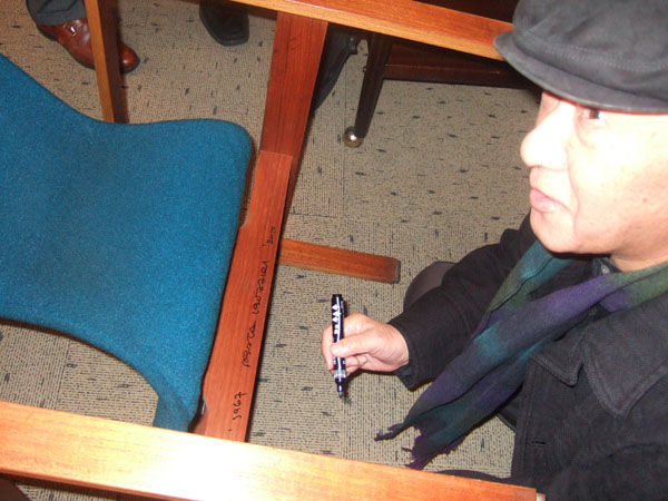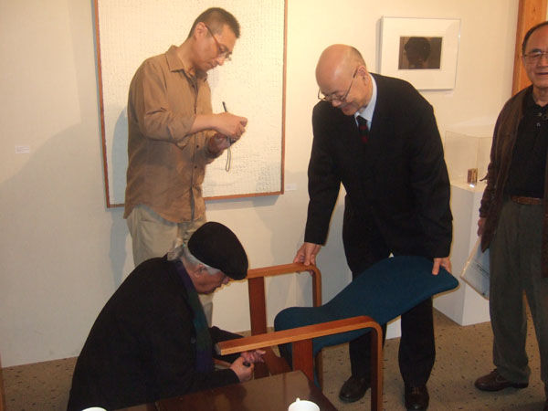磯崎新、椅子にサイン自作の椅子にサインする磯崎新