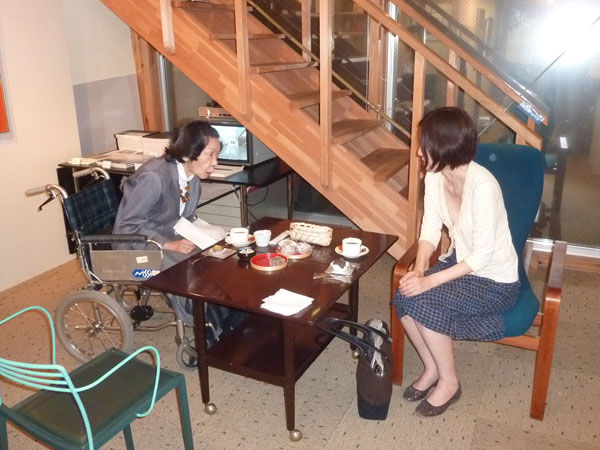 右)久しぶりに自作の椅子に座りゴキゲンな磯崎先生。