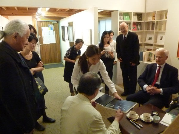 日和崎尊夫句集を贈るファルクマンさん、自著について語る左)亭主からときの忘れものが刊行した『日和崎尊夫句集』を贈る