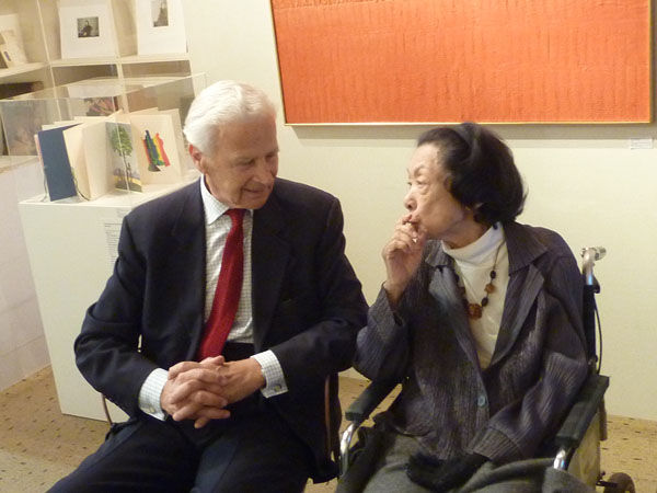 オブジェを見るファルクマン、磯崎新「天文台の時刻にー恋人たち」を見上げるファルクマン左)宮脇先生に贈られたマン・レイのオブジェを前に