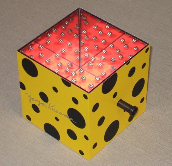 この<鏡の箱>の側面に突き出ている覗き穴から中を覗くと無限にメタリックな球体が続く草間ワールドが出現します。Ed.280となっており、いかにもラージエディションに思えますが実際には半分もつくられていません。版元となりこの作品をエディションしたのは岡部徳三さんですが、2006年に亡くなり、制作が中断されてしまったからです。