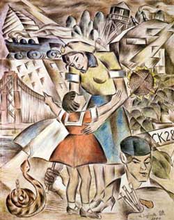 作品からは、厳しい収容所での暮らしぶりやつかの間の休息、そして、親の祖国である日本と自身の母国アメリカとの間に立たされた二世の苦悩がひしひしと伝わってきます。それまで田園の風景を得意としてきたヘンリーの画風をも一変させた収容所生活とはいったい何だったのか、見る者を考えさせずにはおかないでしょう。(主催者HPより)