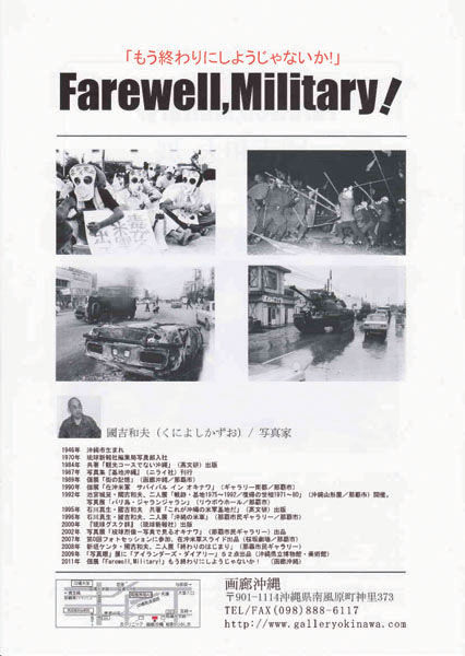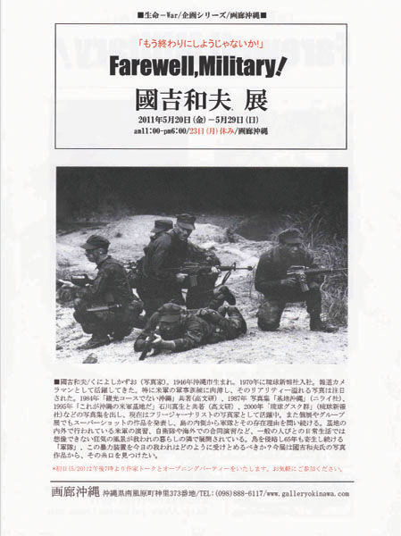 2011年「生命―War」企画シリーズー①は、1970年より沖縄の米軍基地の軍事訓練を激写してきた写真家の國吉和夫(1946年生まれ)の布プリント作品(60×90cm)30点を中心に、紙焼きの写真40点を展示します。