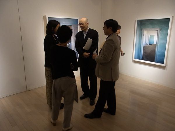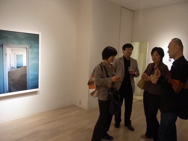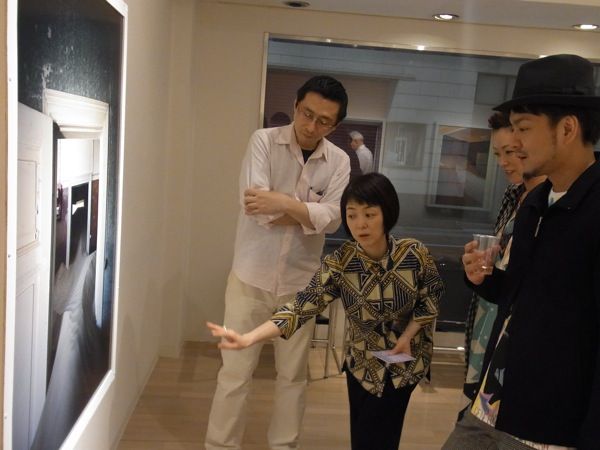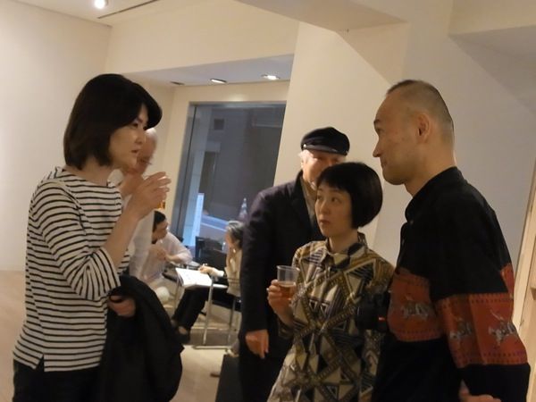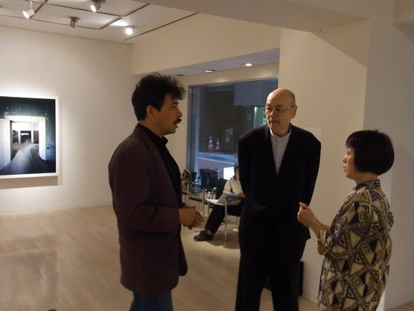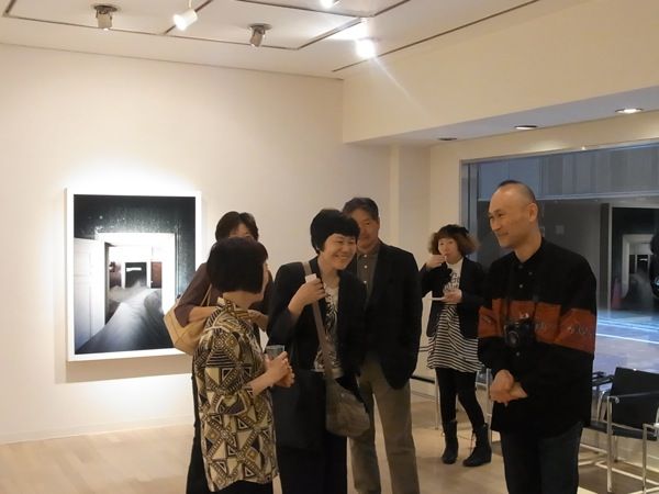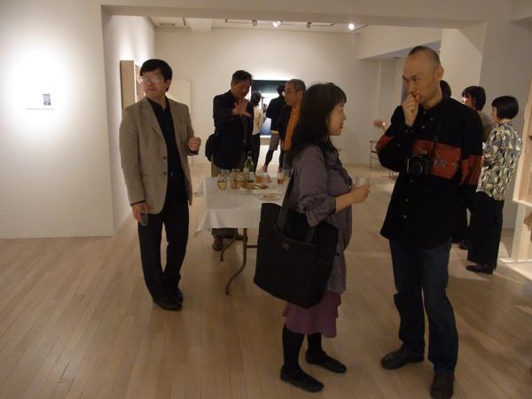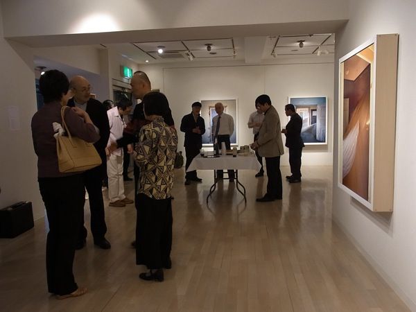 とそんなわけで、本日のブログは、一昨日夜、銀座・ギャラリーせいほうで開催した「ナミビア:室内の砂丘 尾形一郎 尾形優 写真展」オープニング風景を写真で紹介させていただきます(撮影は展示もしてくれた助っ人浜田さん)。