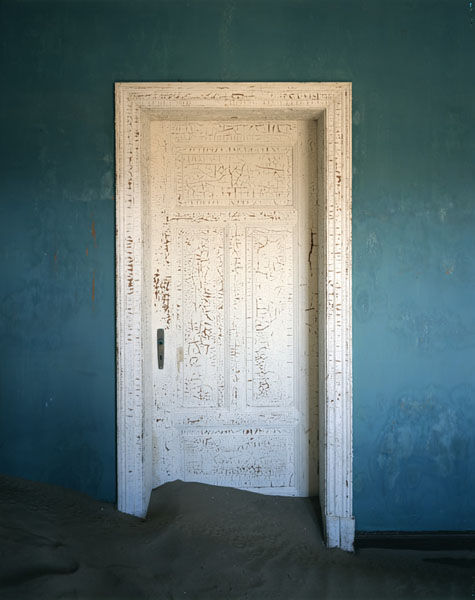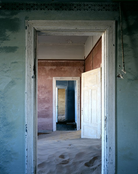 廃墟となり機密性を失った家に、外から風と砂が吹き込み、光が差し込んで、異常な状況を作り出す。そこにあるのは、砂漠にあるべきでないヨーロッパふうの家。ゼツェッシオンを思わせる装飾の壁紙と砂丘のコントラスト。そのありえない組み合わせが、「室内の砂丘」の虚構性の正体ではないか。