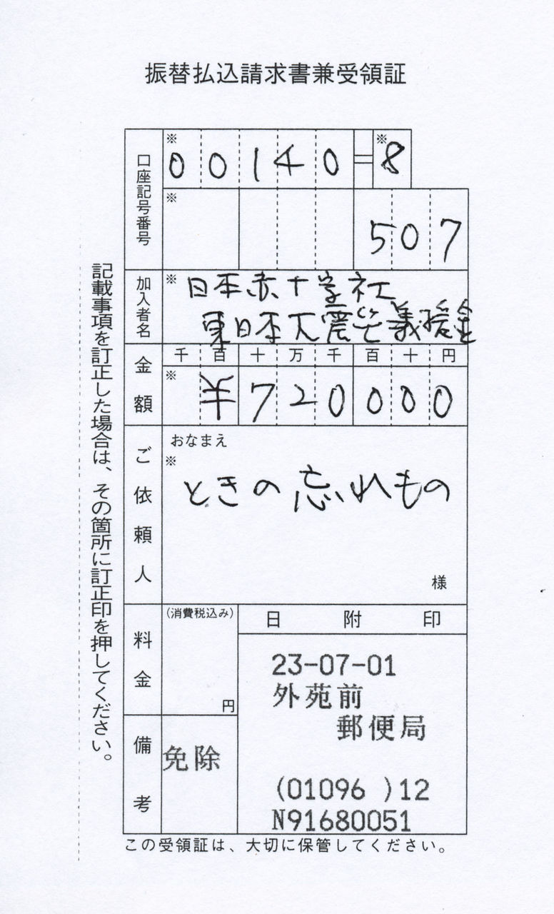 ときの忘れものでは現在までに24点を販売し、その全額72万円をやはり日赤を通じ被災地の皆さんへの義援金として送金しました。第一回の義援金として、合計102万円を寄付したことをご報告します。