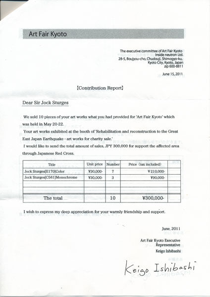 ジョック・スタージスさんから提供された作品を販売し、第一回震災義援金102万円を送金しました