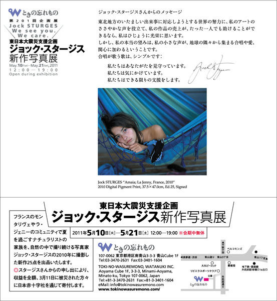 ときの忘れものでは、毎年夏に新作写真展を開催してきましたが、今年は311をうけて、被災地の皆さんを支援したいというスタージスさんの希望で急遽5月に「東日本大震災支援企画 ジョック・スタージス新作写真展」を開催しました。