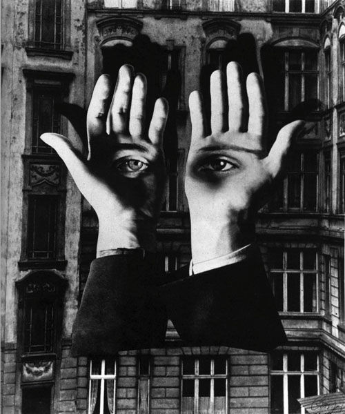 「セルフ・ポートレート」では、バイヤーが鏡の中に映し出された自分自身の姿――右腕を頭の後ろに持ち上げ、すっぽりと抜け落ちた右腕の脇 の一部分を、左手で掴んで持っています。――を唖然とした表情で見つめていて、その様子がバイヤーの肩越しに捉えられています。「孤独な都会人」では切り取られた両腕が建物のファサードの前に浮かび、両方の掌に張りついた眼が真正面を見つめています。