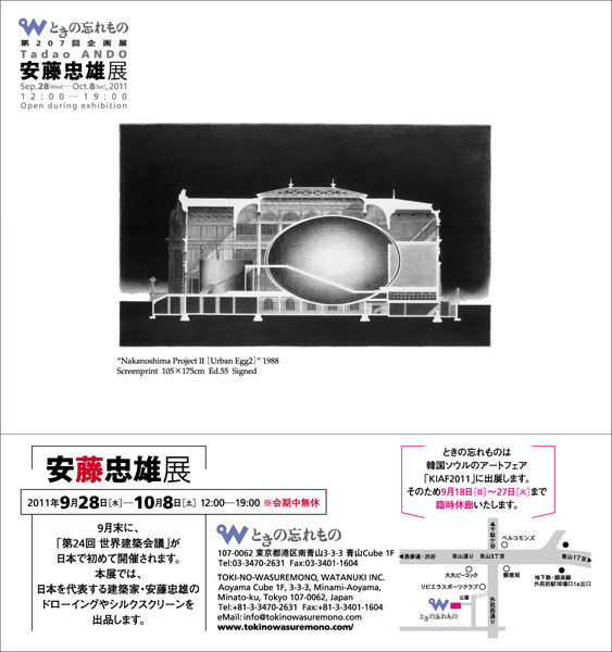 ◆ときの忘れものは、2011年9月28日(水)~10月8日(土)「安藤忠雄展」を開催しています(会期中無休)。