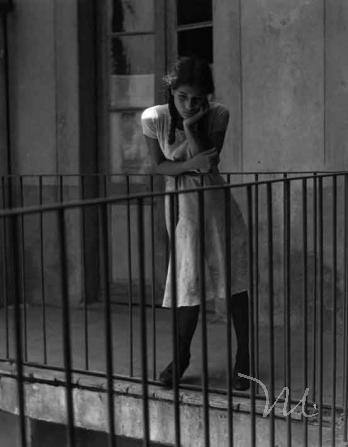 彼の代表作として知られる「夢想(英語 The Daydreaming / スペイン語 El ensueno)」(1931)は、そういった作品の一例です。テラスの手摺に肘をつき、階下を見下ろしている少女が、もう一つの手摺越しに捉えられています。間近から撮られているのにもかかわらず、彼女はあたかもカメラに気づいていないかのように、物思いにふける表情を顔に浮かべています。身体を手摺の方にわずかにもたれさせかけて、脚を流すようして通路に立つその姿は、しなやかなカーブを描き、ワンピースの肩や裾の一部を照らす光と相まって、壁や窓枠、手摺の直線で構成された空間の中に揺らぎのような感覚をもたらしています。「夢想」とは、物思いにふける少女の心模様だけではなく、彼女がいる情景全体の印象をも表しているのではないでしょうか。「腰をおろす人々」と同様に、ブラーヴォの視線は、日常的な光景の中に詩的な場面を掬い上げ、人々の所作を詩の中の言葉として浮かび上がらせているようです。