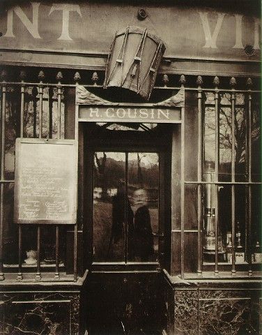たとえば、この写真をアジェの「Au Tambour, 63 quai de la Tournelle」(1908)と見比べて見てみると、戸口を真正面から撮る視点や、戸口や外装のディテールのとらえ方において、ブラーヴォがアジェの写真を強く意識していたことがわかります。アジェは三脚に固定した大型カメラで撮影していたのに対して、ブラーヴォは手持ちのグラフレックス・カメラで撮影していました。そのために、アジェの写真に写っている人の姿――店の中からじっと外を眺めている人と、ドアのガラスに映り込んでいるアジェ自身――は、身動きをしない静止した状態でとらえられていますが、ブラーヴォの写真では、食事をする人々それぞれの自然な所作がそのままに写し取られています。