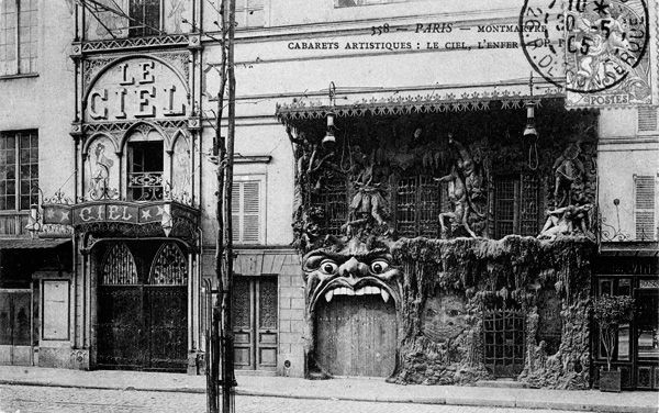 絵葉書を見ると、カフェの外壁全体に装飾がほどこされていたことと、隣には「天国(Le Ciel)」という店があったことがわかります。「天国」と「地獄」が隣り合わせに並ぶ界隈として道行く人の目を楽しませていたのでしょう。(ちなみに店内はこのような感じでした。