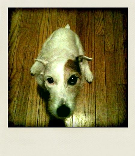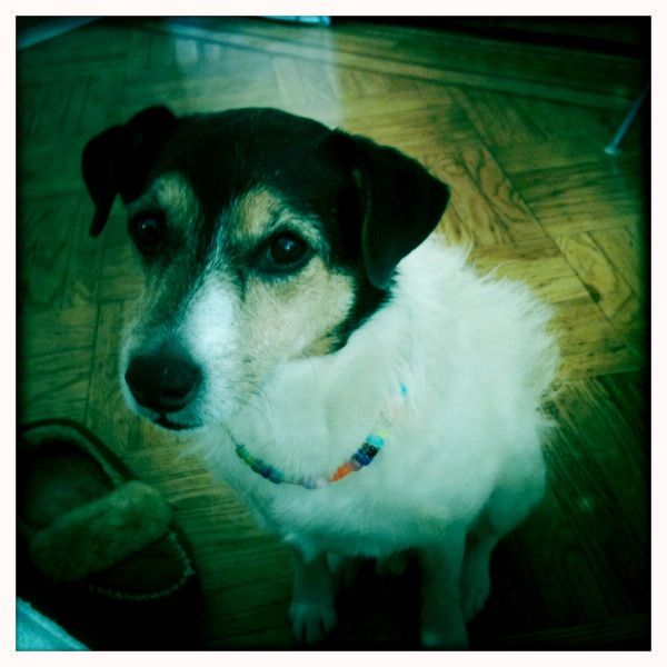 バディがうちに来ることになったのは、昨年春に、駅の近所にあるペットホテルのドアを始め、近所の公園やらペットフードショップなどに貼り出されていた”Buddy for Adoption“の貼り紙を見て気になっていたのがきっかけでした。すでにジャックラッセルを飼っていたので、同じ犬種のバディが気になったのかもしれません。それから1ヵ月後、ある週末、ブルックリンのフォートグリーンにあるフリーマーケットに向かっているとき、近所のスーパーの横で、オレンジ色のベスト(”Adopt Me”と書かれているお決まりのベストです)を着せられた本物のバディに遭遇してしまったのです。近づいていくと、バディは(あとで知ったのですが得意とする)ひざ抱っこをしてきて、一瞬にしてメロメロになってしまったのです。アダプションが頻繁に行われてはいますが、子犬はすぐにもらい手が見つかるらしいのですが、一ヵ月ももらい手が見つからないバディはどうなるんだろう?ということで、うちでもらうことになってしまいました。すでに一匹、まるで人間のように暮らしてきた犬がいるので、どうかなーと思い、まず連れて帰って様子を見ることに。ちなみに、さすがにその場でもらったのではなく、その夜ボランティアをしているクレアさんという女性に電話をして、家に連れてきてもらいました。クレアさんは、保健所から(どういう基準かはわかりませんが)犬を選んで連れて帰ってきては、近所に貼り紙をしたりして、飼い主を探すという活動を個人的にやっているようです。