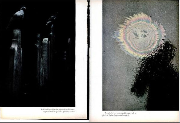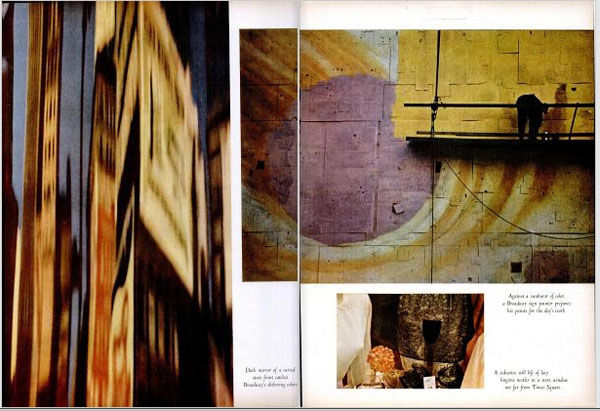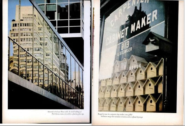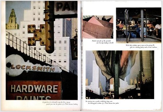 フォトエッセイは、摩天楼とブルックリン橋のシルエットを俯瞰する視点から捉えた写真で始まり、マンハッタンの街をさまざまな視点からとらえた写真によって、読者を街中への散歩へと誘うような方法で構成されています。「色彩の魔術師」として名を馳せるようになったハースのカラー写真の技量は、一点一点の写真のみならず、見開きでの写真の組み合わせ方にも見て取ることができます。