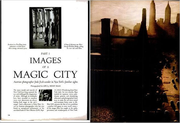この写真はカラー写真の先駆者として知られるエルンスト・ハース(Ernst Haas, 1921-1986)が、ニューヨークを取材して制作し、グラフ雑誌「ライフ」の1953年9月14日号と9月21日号と2回にわたって掲載された、フォトエッセイ「Images of a Magic City (ある魔法の街のイメージ)」の中の一枚です。「ライフ」は1936年から1972年まで刊行され、フォトジャーナリズムの黄金時代を築いた雑誌として広く知られており、現在はGoogle Booksで、全号を閲覧することができます。