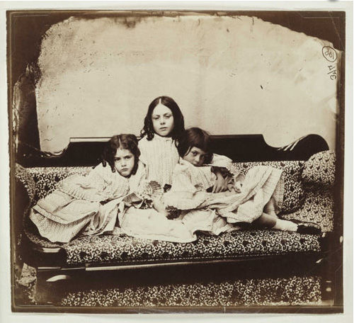 ルイス・キャロルの撮った少女たちをこのようなカルト・ド・ヴィジットと比べてみると、彼の写真に捉えられている少女たちの自然な表情や所作がより際だっています。彼女たちが横たわる長椅子には生活の跡が色濃く表れていて、寝そべった少女たちは、撮影の前後で眠っていたのかもしれないと思わせるほどリラックスしているようです。寝そべり、眠りと目覚めの間にたゆたう少女たちの写真は、『不思議に国のアリス』の夢の世界に接合するような雰囲気を漂わせていると言えましょう。