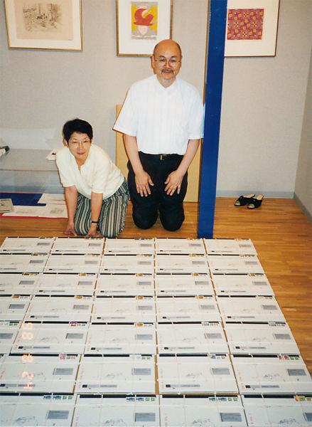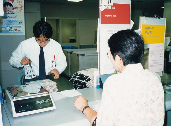 1998年8月24日 第一信を磯崎新アトリエのある赤坂郵便局(ときの忘れものからも一駅)から郵送しました。スタンプが絵にかからないよう捺されるのをじっと監視、さらに証拠写真まで撮るので、郵便局員さんから「あなたたち、いったい何を撮っているんですか!」と咎められたことも再三でありました。