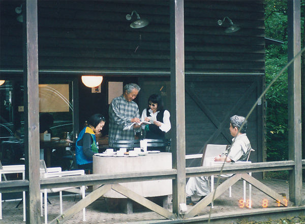 1998年8月軽井沢での打ち合わせ。左から宮脇愛子先生、磯崎新先生、35人の書簡受取人のひとりNさん、そして植田実さん。