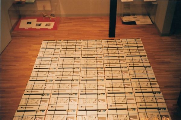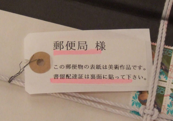 色とりどりの記念切手がデザイナー(北澤敏彦さん)の指示で決められた位置に貼られ、毎月違う色に染められた紐(凧糸)で縛られて完成した「美術品」を郵便局に運び込み、「書留」のスタンプを捺してもらい(これも絵にかからぬよう郵便局員さんに場所を指示して)郵送しました。