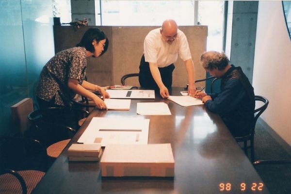 刷り上った銅版画とパッケージ表紙にもサインをする磯崎新先生。1998年8月からの一年間は磯崎新先生の版画制作が最も集中的になされた時期でした。