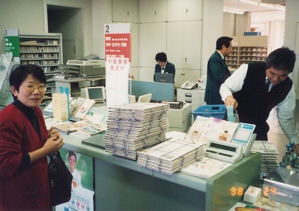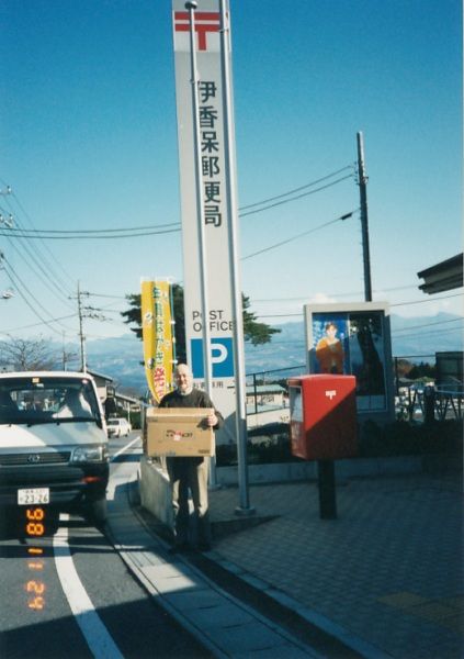伊香保郵便局の前で。いつもダンボール箱に35通を詰めて持ち込んでいました。