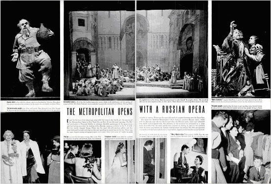 (図2)見開き2ページの「ライフ」の記事は、上半分が上演された歌劇『ボリス・ゴドゥノフ』の舞台写真、下半分は観客を捉えた写真で構成されています。メトロポリタン歌劇場のシーズン初日は、着飾った社交界の面々や著名人たちが足を運ぶ華やかなイベントとして知られ、その様子を取材するために、多くの報道陣も劇場に詰めかけていました。ウィージーは、カヴァノー夫人がリムジンを降りる場面(図3)や、カヴァノー夫人とデシーズ夫人が歌劇場の中で多くの報道陣のフラッシュとカメラに取り囲まれている様子を彼女たちの背後から撮影しています。(図4)