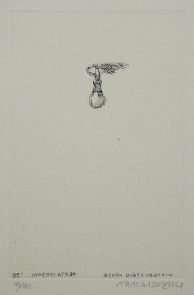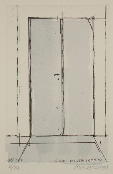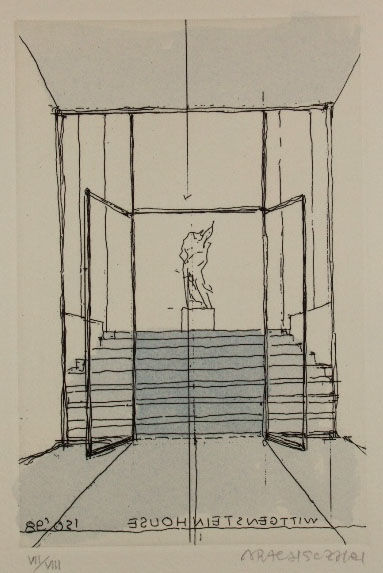 今回のエッチング。ヘルミーネの描いたスケッチ、磯崎さんによれば、生活のための舗設の背景として「なにもない余白」を見せているスケッチと違うし、逆にルートウィッヒの世界以外は生活も何も見えない写真とも違う。ガラスの壁やドアを縁どる磯崎さんの描線は、これは結局は何と定義できるのか、また考えはじめてしまいました。(文責・植田)