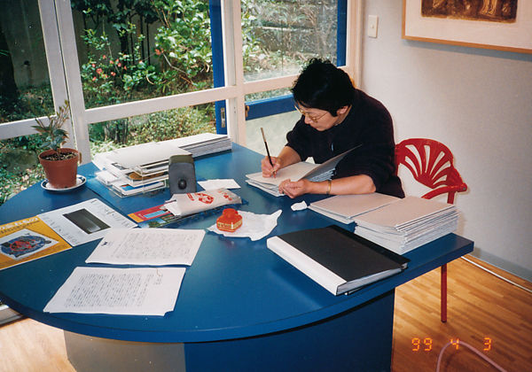 第八信の小冊子の一冊一冊に限定番号を入れる社長。当時のときの忘れものはしもた屋風の一軒家で中庭には紫陽花などが植えられていました。