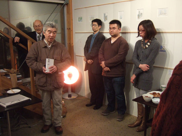展示してある磯崎新銅版画連作『栖十二』の企画者である植田実先生はじめ、来年個展を予定している大竹昭子さん、井桁裕子さん、尾形一郎・優さんなど作家や、顧客の皆さんにお集まりいただき賑やかに2011年を語りあいました。