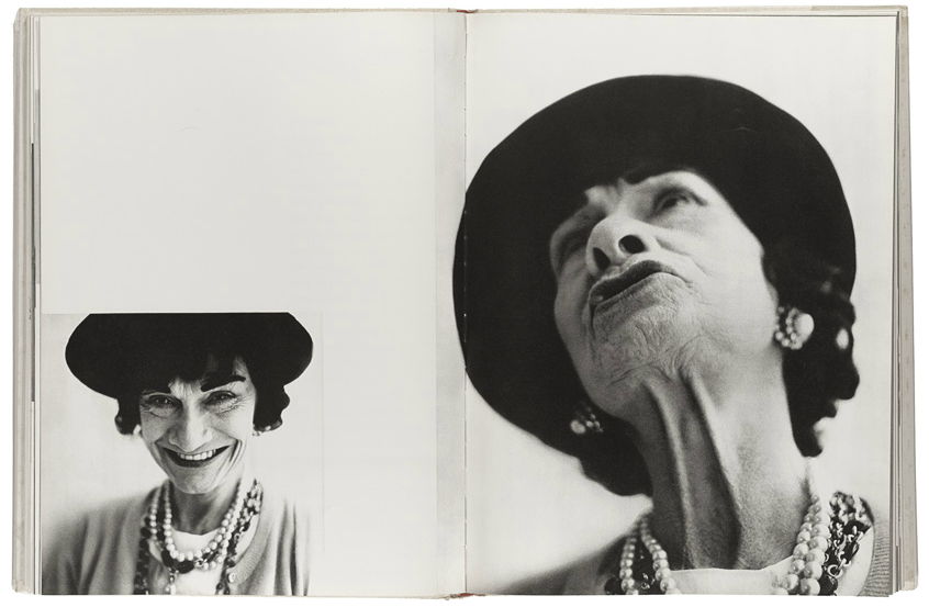 1940年代からポートレート写真、ファッション写真や広告写真など幅広い分野で活動したリチャード・アヴェドン(Richard Avedon, 1923-2004)http://www.richardavedon.com/は、その長いキャリアの中で一貫して人の容貌や表情を注視して撮影に取り組んでいました。(図1)のように、被写体の人物を白い背景の前に配置して余分な要素をそぎ落として撮影する手法は、アヴェドンの活動の初期から特徴的なスタイルとして知られています。初期の作品の一例として、アヴェドンが最初に刊行した写真集『OBSERVATIONS』(小説家のトゥルーマン・カポーティによる解説、1959) に掲載された、マリリン・モンロー(図2)とココ・シャネル(図3)のポートレート写真を見てみましょう。マリリン・モンローといえば、アメリカのセックスシンボルと称され、コケティッシュな魅力をふりまく演技や、セクシーな肢体や表情が思い起こされます。しかし、この写真(図2)では、遠くに視線を向けていて、カメラに向かって表情を作る前に不意を突かれたように、無防備な呆然としたような表情をしています。ココ・シャネルの写真(図3)を掲載したページでは、笑顔の写真と、のけぞって首筋を強調してとらえた写真を見開きで組み合わせることで、彼女の強烈な個性を際立たせています。いずれの写真からも、アヴェドンが、被写体に対峙する際に、その人物が奥底に秘めている表情を引き出し、その一瞬をとらえる鋭い観察眼を具えていたことがわかります。