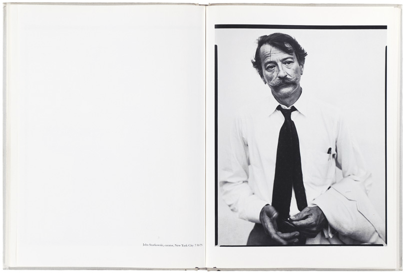 (図4)『PORTRAITS』(1976)より ジョン・シャーカフスキー『PORTRAITS』(1976)や、『In the American West』(1979年から1984年の5年間にわたって、アメリカ西部13州189都市で撮影されたポートレート写真のシリーズ 1985)のような1970年代以降に刊行された写真集では、(図3)のようなトリミングをほどこして編集された写真ではなく、黒縁を残したままの写真が収録されています。一例として『PORTRAITS』のジョン・シャーカフスキー(当時のニューヨーク近代美術館の写真部門ディレクター)の写真を掲載したページ(図4)を挙げておきましょう。(図4)も(図1)と同様に、縦位置で上半身全体が撮影されており、体格や姿勢、所作が精緻に描写されています。このように胴体を画面の中に入れる撮影の仕方では、必然的に頭部が画面の中に占める割合が少なくなります。それでもなお、顔の表情の印象が薄まっておらず、画面全体のバランスのなかで、顔の表情が強く印象に残るのは、アヴェドンの撮影の技術のみならず、周到なプリントの仕方に依るところが大きいと言えましょう。