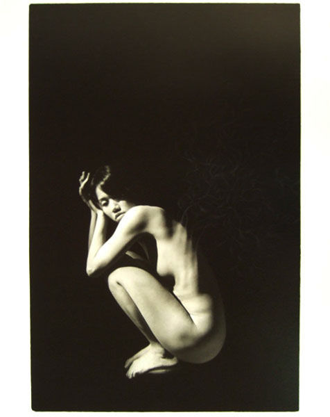 この画像ではよくわからないと思いますが(ぜひ会場に来て実物をご覧になってください)、裸身の背に天使の羽のような、淡い霧のようなものが細かい点(ひっかききず)によって描かれています。