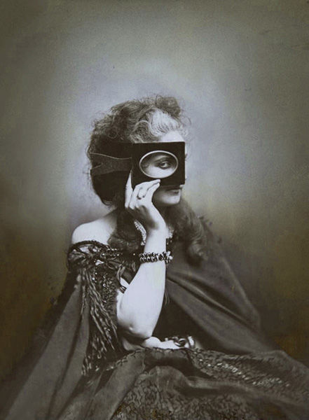 目元を隠した女性の写真といえば、写真史上の名作の中にもいくつか挙げられます。一つは、ピーエル=ルイ・ピアソン(Pierre-Louis Pierson, 1822-1913)が撮影したカスティリオーネ伯爵夫人(1837−1899)のポートレート写真(図2)。ポートレート写真の名作として写真史上よく知られているこの写真では、カスティリオーネ伯爵夫人——当時の社交界の名花として名を馳せた美貌の持ち主で、ナポレオン三世の愛人でもありました——が、右手に持った写真の額を仮面のように顔にあて、覗き見をするようなポーズをとらえていて、ドレスから右の肩と腕が露わになっています。この写真を(図1)と見比べてみると、身体の向きや隠された部分と露わになった部分は対照的ですが、ランスが(図1)を撮影する際に、モデルの姿勢や、髪型、表情、小道具の使い方などの演出方法において、カスティリオーネ伯爵夫人のような雰囲気を醸し出すことを意識していたということは充分あり得ることだと言えるでしょう。