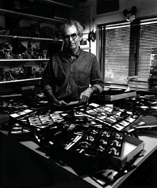 1960年代以降、ユルズマンの作品は、ストレート写真が主流を占めていたアメリカの写真の潮流に革新的な表現として脚光を浴びました。デジタル技術が進歩し、コンピュータ上での画像合成が容易になった現在の視点から見ると、彼の作品は、アナログの技法による写真合成の卓越した技巧やその先駆性という側面に注目が集まりがちです。しかし、ユルズマンのウェブサイトのGALLERIESのページで、1950年代から現在にいたるまでの彼の作品を通覧してみると、彼が長年にわたる制作活動の中で、独特の世界観(人工と自然の対比、浮遊の感覚、神話の世界)を構築するために、モチーフを蒐集し、吟味し、選び出す作業を入念に続けてきたことが判ります。作品制作の過程でプリントした膨大なコンタクトシートを前に広げて佇むユルズマンのポートレート写真(図3)は、イメージのコレクターとしてのユルズマンの側面を端的に表していると言えるでしょう。